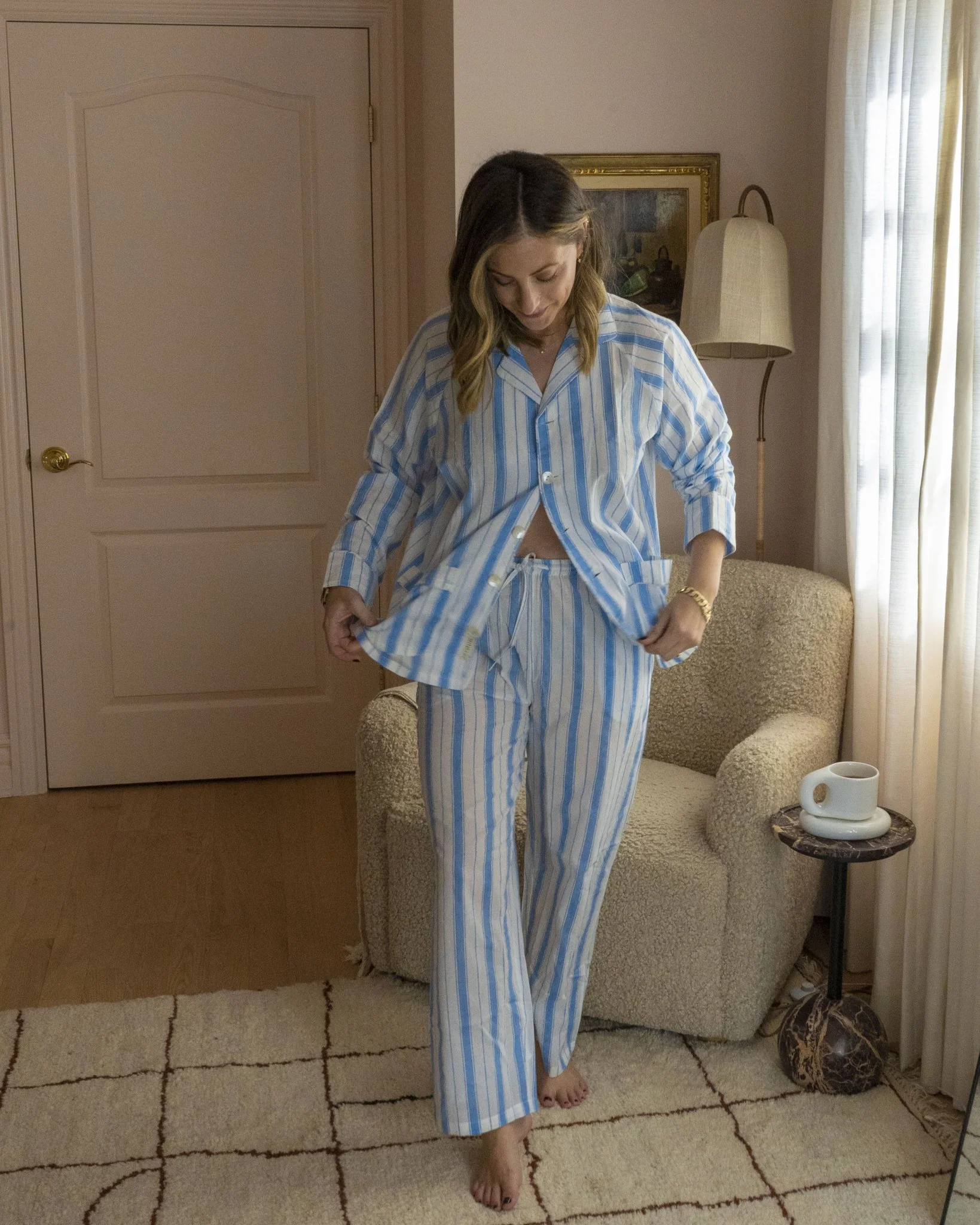 The first-ever Carly Home stripe is bold, bright, and timeless. The shirt is versatile enough for both day and night, while the breathable cotton fabric ensures ultimate comfort. Maximum convenience is achieved through pockets in the shirt and drawstring pants. Subtle details such as mother of pearl buttons and cuff detail on the sleeve create an elegant look.